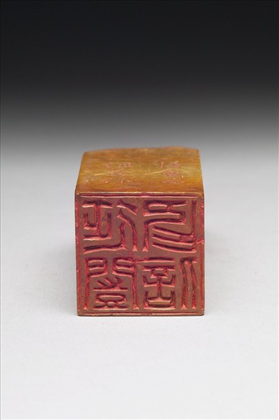 壽山石章,黃色。長方體,頂作不規則斜面,印面正方。印面陰刻「延闓印信」四字篆文。邊款行書:「憶盦為組葊作。」印身淺琢老松、樓閣、橋與溪等紋飾。與「組盦」石章(贈玉166)成對。
