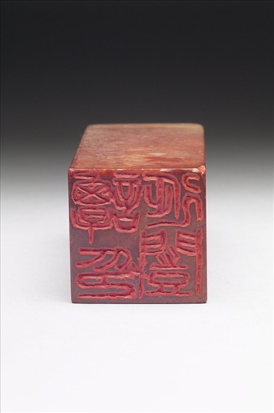 壽山石章,深紫色。長方體,印面方正。印面陰刻「譚延闓印」四字篆文。邊款:「唯十五年一月八日。陳師曾作于京都。」師曾是清末民初印人陳衡恪的字,由邊款看來,此印為陳衡恪所治。頂面刻龍紋,頂下四周亦飾龍紋一道。與「祖安」石章(贈玉167)成對。