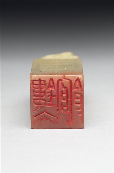 青田石章,淡黃色。長方體,印面方正。印面陰刻「鏤冰管」三字篆文。邊款:「祖公大書家雅玩即正。芳草詞人湘北。杏花春雨江南。洪邑李猷龍刊贈。」印身一面陰線刻竹圖與行書題詩及款:「鄭板橋詩云。衙齋夜聽瀟瀟竹。疑是民間疾苦聲。些小吾曹州縣吏。一枝一葉總關情。觀此可想見其為人也。爰照其法寫之。庚午春,猷龍作於首都。」一面毫芒陰刻蘇軾「前、後赤壁賦」全文,有款識:「庚午孟春。前雲南西疇縣知事李猷龍刊於金陵旅邸。」另面陰線細刻赤壁圖,並有隸書題「蘇子多情」,行書款:「民國十九年春。金陵紗帽巷旅次。摹元人法於西軒。蜀南李恕寫。」鈕雕一大兩小共三獸。此印為李猷龍所刻,與「祖安曾藏」石章(贈玉175)為一對。