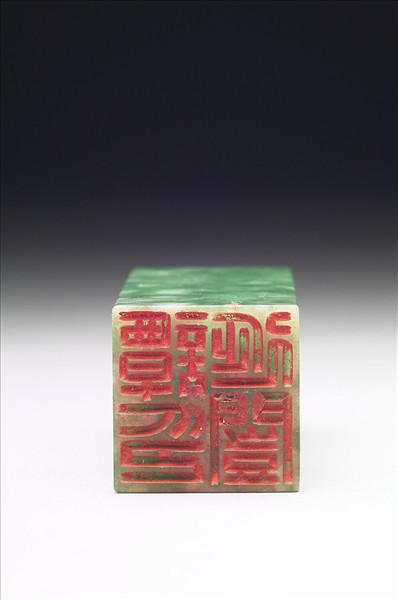 玉章,翠綠色,帶白色斑。長方體,印面正方。印面陰刻四字篆文:「譚延闓印」,四字等分,「印」字橫刻,更添穩重。此印與印文為「祖安」的章(贈玉189)成對。