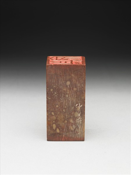 壽山石章,棗紅色,帶黃斑,表面有細白刮痕。長方體,雙印面,印面正方。一面陽刻四字篆文:「譚延闓印」,另面陽刻二字篆文:「組安」。邊款:「仲嘉」,由邊款可知此印作者為印人余仲嘉。與十五方印(贈玉190-205)同儲於一木盒。