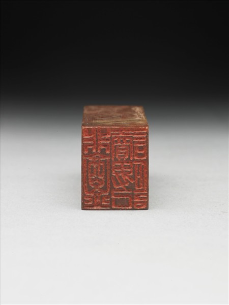 壽山石章,赭色,帶黃白色及黑色斑。長方體,雙印面,印面長方。一面陰刻五字篆文:「非盦讀碑記」,另面陽刻十字篆文:「故人思誼重不忍更雙飛」。邊款:「壬戌嘉平。瘦鐵刻。」「戩園」「甲子三月。仲嘉刻。」「仲嘉」,從邊款看來,此印曾為印人錢厓(號瘦鐵)、余仲嘉、黎澤泰(號戩園)所治。與十五方印(贈玉190-205)同儲於一木盒。