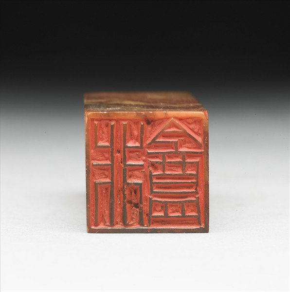 壽山石章,顏色斑駁。長方體,雙印面,印面正方。一面陽刻二字篆文:「非盦」,另面陰刻四字篆文:「旡畏手書」。邊款:「撝叔此派有快劍斫蒲葦之勢。近人齊借山亦喜仿之。丁巳二月。戩士并志。」撝叔為趙之謙的字,齊借山即齊白石。此章與十五方印(贈玉190-205)同儲於一木盒。