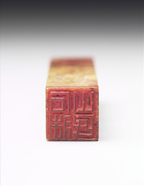 壽山石章,黃赭色夾雜,有裂痕。長方體,印面正方。印面陽刻四字篆文:「石床山民」。邊款:「仿小松法。戩士。」小松乃黃易的號,從邊款得知此印為印人黎澤泰仿黃易所治。與十五方印(贈玉190-205)同儲於一木盒。