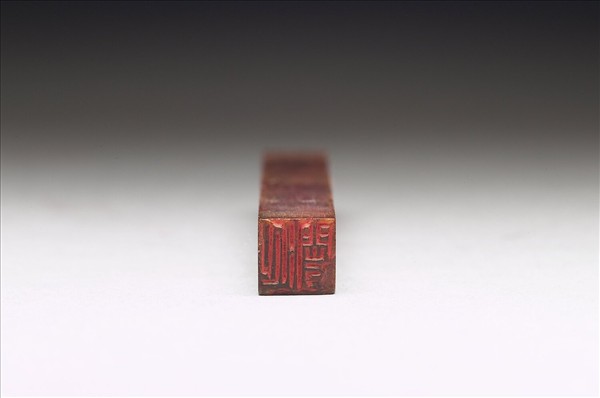 壽山石章,棗紅色。細長方體,印面正方。印面陽刻二篆字:「延闓」,二字平分空間,「闓」字左下有缺。邊款:「畏丈大人正刻。姪泰。」此印為印人黎澤泰所治。與十五方印(贈玉190-205)同儲於一木盒。