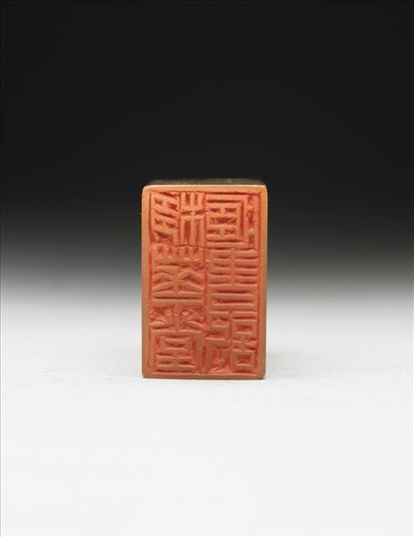 青田石章,黃綠色。長方體,印面長方。印面陽刻六字篆文:「栘華堂藏書記」,「記」字右下的空間與「華」字「鈢」下左側空間相呼應,規矩中帶點靈動。邊款:「栘華堂藏書記。丙寅二月。鈢齋作。」由邊款得知此印為印人李尹桑(號鈢齋)所作。瓦鈕,鈕刻飾仿古龍紋。與十七方印(贈玉206-223)同儲於一木盒。