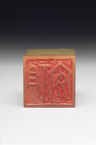 青田石章,黃綠色。長方體,印面正方。印面陽刻二篆字:「祖安」,上密下疏,「祖」字的「且」下方留空隙。邊款:「鈢齋。」鈢齋是李尹桑的號。瓦鈕,鈕刻飾仿古龍紋。與十七方印(贈玉206-223)同儲於一木盒。