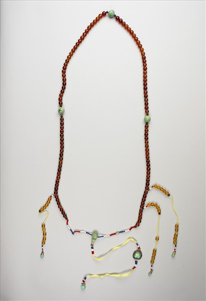 琥珀紅褐色澤,透明。整個朝珠串由一百零八粒琥珀珠貫穿而成,每隔二十七粒穿入一粒稱為「佛頭」的大珠,與垂于胸前正中的一粒佛頭相對的則稱為「佛頭塔」,其下並有墜飾,皆為土耳其石。在佛頭塔兩側綴有三串小珠,每串小珠十粒,名為記捻。朝珠源自數珠,是清代君臣、后妃、命婦穿著朝服或吉服時,垂掛在胸前象徵身分地位的飾物。