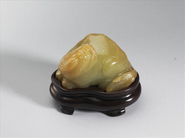 黃玉,帶有白斑。辟邪回首作屈膝趴伏狀,辟邪頭頂作一獨角。附木座。