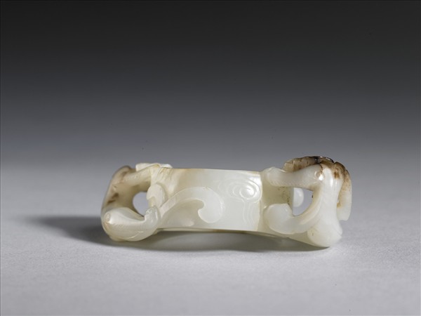 玉質,有局部灰斑與赭斑。全器為環形,有兩隻立雕螭,攀於圈環上,一隻口啣於圈沿,另一隻則以前腳趴放邊緣。圈環上另有陰刻卷雲。