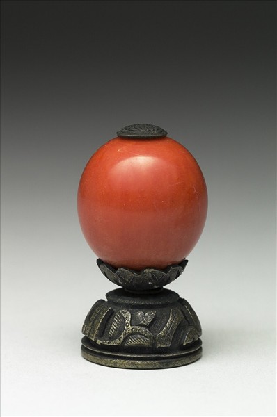 染色石,色澤鮮紅。全器作圓球體,於一面陰刻有團「壽」字,並鑲嵌於金屬座上,金屬座上雕有幾何圖案。頂戴為清朝官吏帽頂上的珠飾,根據官階的不同而使用不同質材。