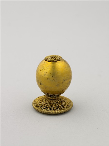 鎏金,通體金黃。全器作圓球體,鑲嵌於金屬座上,金屬座飾以三層菊瓣紋。器底有兩孔,並有針刻款:「西河沿。啟盛。」頂戴為清朝官吏帽頂上的珠飾,根據官階的不同而使用不同質材。