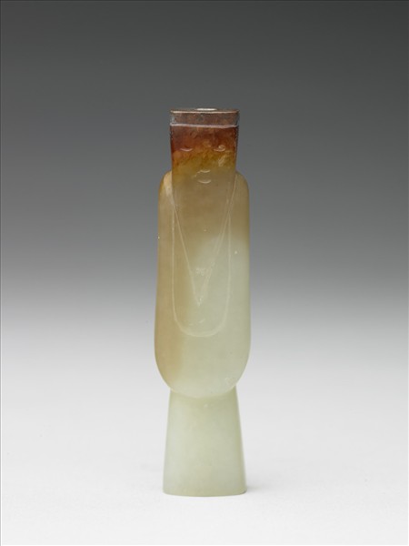 玉質,有大片黃斑,並有深赭沁色。全器略呈長棒狀,雕一文士雙手交握,做揖手狀。人物的眼鼻嘴及驅幹上的服裝,皆以簡單的陰刻線表示。人物頭頂為平頂,並有一小孔。