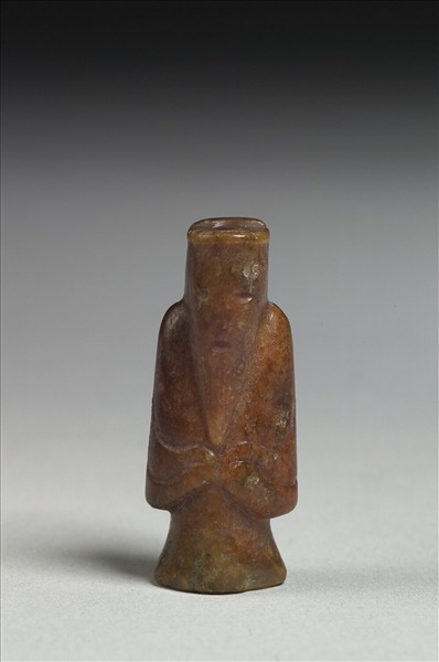 玉質,全器大半沁成深褐色。全器略呈圓柱狀,雕作一文士,臉部細節模糊不清,只有兩袖有清楚輪廓。人物頭頂為平頂,並有一小孔。
