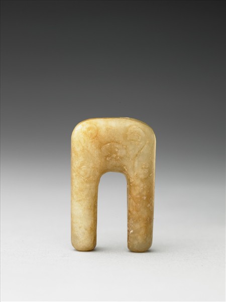 玉質,白斑及黃赭斑遍布。全器呈「ㄇ」字形,器上部並陰刻有S形卷雲及如意雲紋。「ㄇ」字形上部頂端,另有兩小穿。