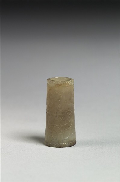 玉質,有淺赭斑,局部有深赭沁色。全器為管形,剖面為圓形。器壁紋飾分作兩層,上陰刻有卷雲紋,下則為簡化獸面紋。器中有穿。
