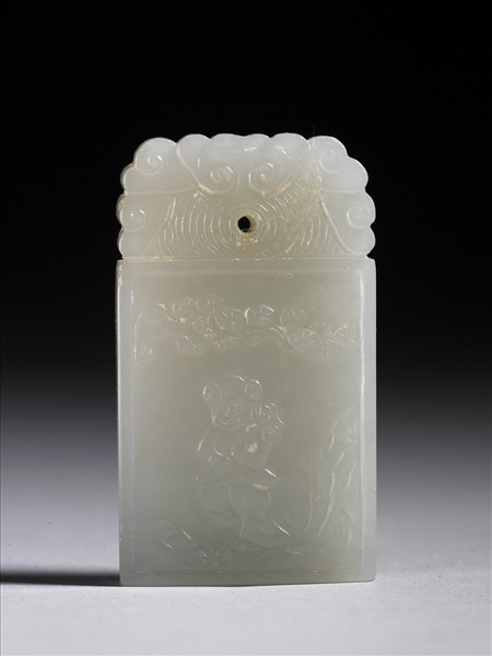 玉質,有白斑紋。全器作片狀長方形,上端浮雕卷雲,中間有一小穿,畫牌一面作手持靈芝童子站於松樹下,另一面有篆書詩文,並有「子」「岡」落款。