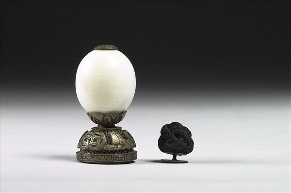 硨渠貝,色澤白而略有黃斑,表面有橫向的紋路。全器作橢圓球體,鑲嵌於金屬座上,金屬座上雕有雙錢、蕉葉與蝙蝠。頂戴為清朝官吏帽頂上的珠飾,根據官階的不同而使用不同質材。