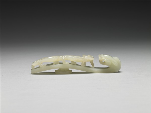 白玉,此器曲鉤部份做龍首,鉤面立雕一蟠螭,背面有一圓柱。