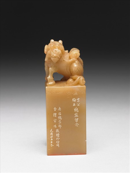 黃白漸層,印面為正方形,印身為長方形,印紐作長角、長鬚,背負書卷之異獸,呈半蹲踞狀,印身上緣陰線刻一道回紋。篆體陰文「吉星福印」印文,側邊上款「吉公、梅五總監留念」、下款「兵站總監部全體官佐敬贈於徐州、民國卅五年冬(1946)」,皆為陰刻填白楷體。與贈玉287為一對。
