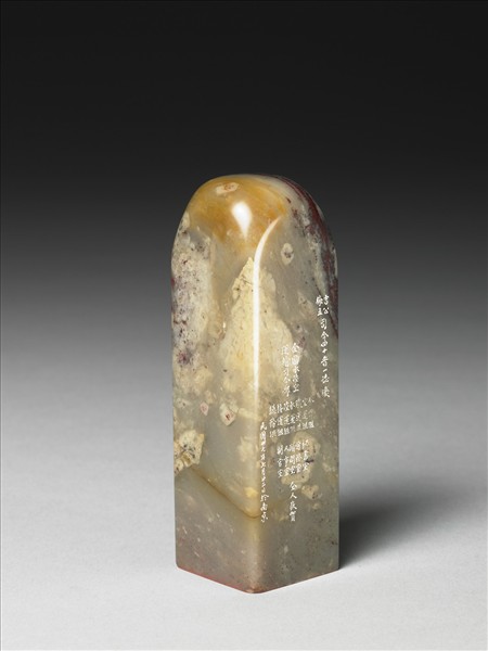 雞血石,色灰黃,佈滿赤紅色斑紋,陽文篆款「軍需總監」印文、一面邊款陰刻填白楷體「丁卯端陽後、小池刻 時年六十八」,另一面陰刻填白楷款「吉公梅五司令四十晉一誌慶」、「全國水陸運輸司令部參謀組 空運組 鐵運組 水運組 空運組 接運組 總務組 秘書室 財務室 顧問室 人事室 副官室 仝人敬賀」、「民國卅七年七月廿二日於南京」。與贈玉292為一對。