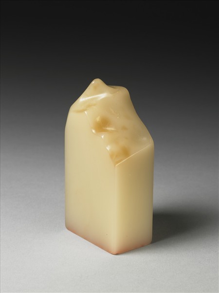壽山芙蓉石,白中泛黃,長方形,作山子之形,底刻「靜篤」二字陰文篆款。