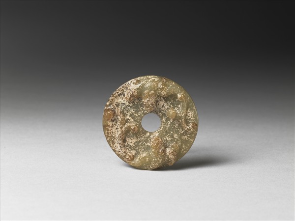 玉質,有沁斑。一面浮雕雙螭,另一面飾以乳丁紋。