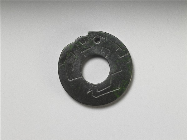 墨色中滲有綠色紋。全器雕獸紋,首尾相接而成系璧,壁面以凹雕幾何形雲紋,勾勒出獸足,有一穿帶孔,亦是獸眼。兩面紋飾相同。
