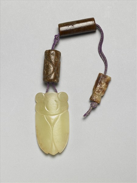 佩蟬雙眼作圓形,有雙翼,頂部有象鼻穿,上穿一帶,帶上附穿二翁仲。佩蟬為黃色,翁仲二皆沁成赭色。玉管為玉質,受沁成赫色斑紋。二翁仲為明代,玉管為新石器時代晚期。
