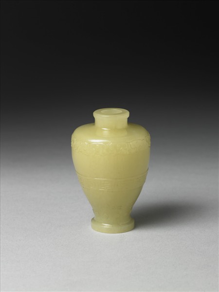 玉質,器形如甕,直口,口緣向外捲,寬肩,斂腹,圈足,肩部浮雕蟠螭紋一道,腹部浮雕回紋一道,底部雕乳丁紋一道。附雕花圓形木座一只。