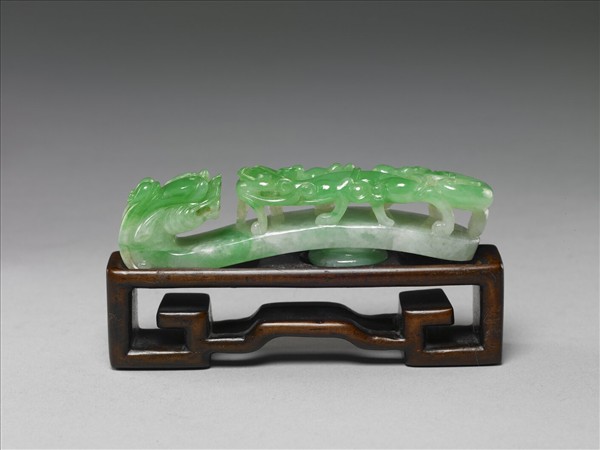 翡翠製帶鉤,鉤首浮雕龍首紋,鉤面鏤空雕蟠螭一,背面有一圓柱,圓柱面浮雕一花卉。帶鏤雕幾何形木座。