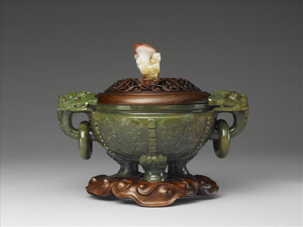 碧玉爐夾雜赭色斑,深弧壁,三獸首足,雙龍首耳各帶活環。帶一木製鏤雕圓頂蓋,雕飾如意雲頭紋及纏枝花紋、蓋頂以瑙雕靈芝為飾。爐外壁浮雕獸面紋。附一淺棕色不規則形木座,器表雕飾雲紋。