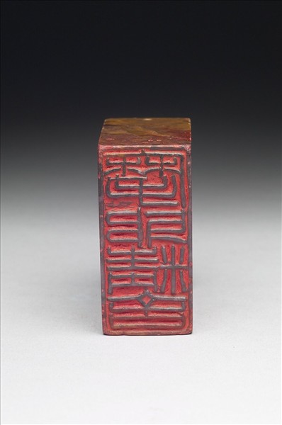 石章,印面長方,色灰黑與橙紅各半。印面陽刻四字篆文「摩耶精舍」,邊款「大千先生近營精舍於雙溪畔,命此嘉名,刻石賀成。壯為,丁巳」,另有頂款「摩耶精舍。漸齋」。