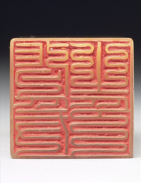 青田石印,印面正方,色乳黃,有半透明白色斑紋。印面陽刻四字篆文「張爰之印」,作細朱文八疊文體,邊款「辛卯冬,紹杰仿宋紹興文思院鑄印。刻奉大千先生」。印頂作壇鈕式。