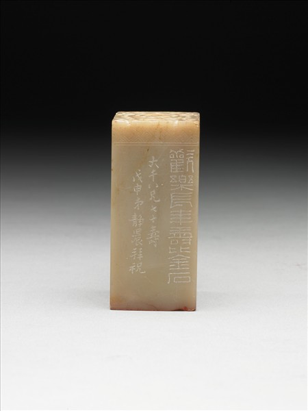 昌化石印,印面正方,色乳白帶黃,質材密潤略呈半透明。印面陽刻四字篆文「大千長年」,邊款「歡樂長年,壽比金石。大千八兄七十壽。戊申,弟靜農拜祝」。印身接頂處飾回紋一周,頂淺浮雕簡化獸紋。