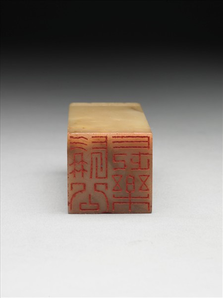 昌化石印,印面正方,色乳白帶黃,質材密潤略呈半透明。印面陰刻四字篆文「髯公長樂」,邊款「闢混沌手,得天地心。大千八兄七十壽。戊申,弟靜農」。印身接頂處飾回紋一周,頂淺浮雕簡化獸紋。