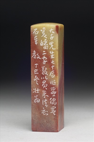 青田石印,印面正方,青黃色與橙紅色相間。印面陽刻二字篆文「爰皤」,邊款「大千先生七十後作畫偶署爰皤二字,敬以員朱法刻石奉教。丁巳冬,壯為」。