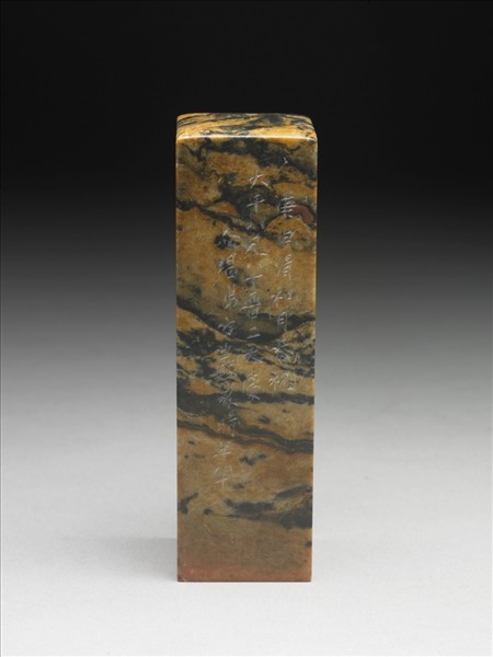 青田石印,印面正方,不透明深棕色間有黑色紋理。印面陰刻四字篆文「大千長壽」,邊款「庚申清和月,恭祝大千八兄八十晉二大慶。介堪弟方巖篆,時年八十」。