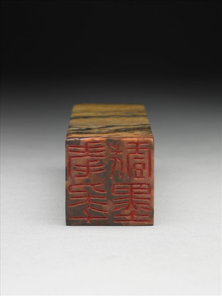 青田石印,印面正方,不透明深棕色間有黑色紋理。印面陰刻四字篆文「耄年戲墨」,邊款「介堪作於蟬園」。