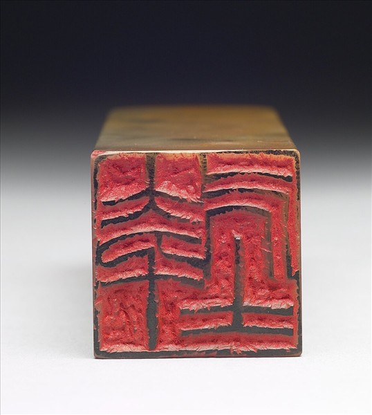壽山石印,印面正方,色灰白間橙黃,中有黑紅諸色紋理。印面陽刻四字篆文「大千居士」,邊款「六十三歲甲寅新正。吳平」。