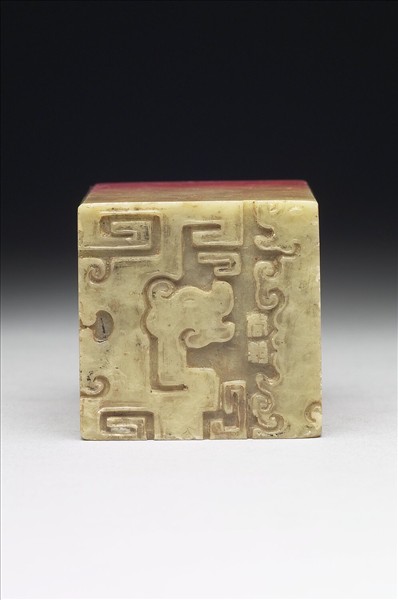 青田石印,印面方正,色乳灰泛青,印身吃朱極深。印面陰刻三字篆文「千千千」。根據《大千印留》、《張大千先生書畫印輯》,此印為大千先生親治。印鈕作平雕幾何化博古夔紋,並有剔地陽文款「尚均」,尚均即清初壽山石紐雕刻名家周彬,其作品也叫「尚均紐」。