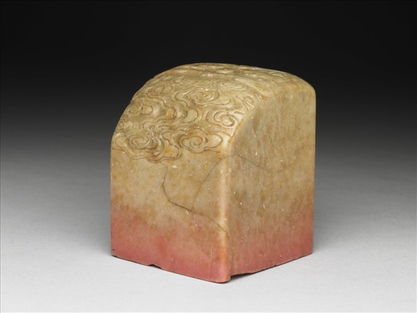 青田石印,印面方正,色乳灰雜青,有璺。印面陽刻四字篆文「大千居士」。頂一面削斜,作雲龍紋平鈕,淺浮雕二螭相對,周密雕雲紋。與贈玉365成對。