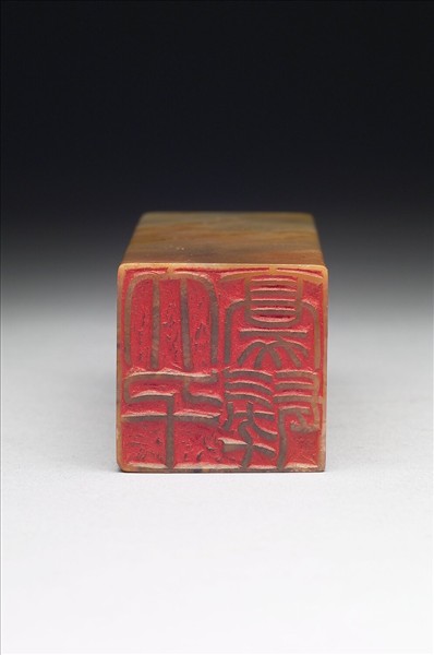 石章,印面方正,色橙黃間綠,有斜絲狀半透明紋理。印面陽刻四字篆文「大千豪髮」。頂款「大千先生正畫。其石,壬申八月」。