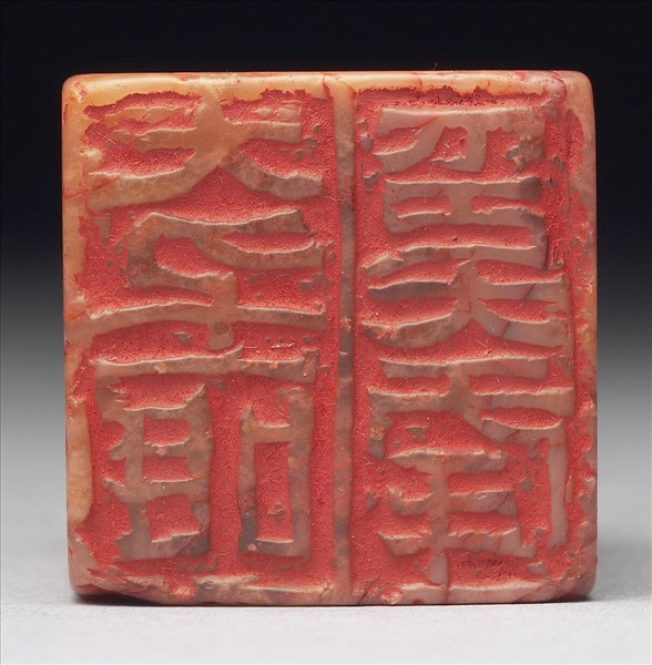 壽山石印,印面正方,色白布滿紅色絲紋。印面陽刻六字八分書「大千唯印大年」。無邊款,據《大千印留》、《張大千先生書畫印輯》,此印為大千先生親治。