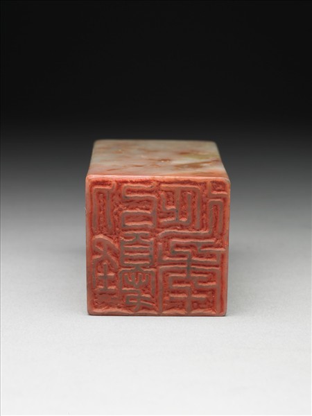 壽山石印,印面方正,色乳灰間磚紅色。印面陽刻四字篆文「以𢥙延年」。邊款「丙辰四月朔日為吾大千八兄七十晉八壽。弟靜農拜篆」。