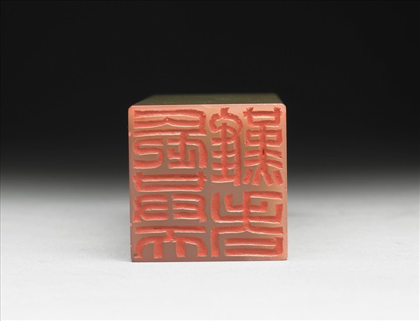青田石印,印面方正,色青白,微有璺。印面陰刻五字篆文「長共天難老」。邊款「介堪作于玉篆樓」。