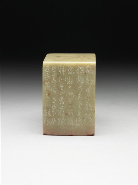 壽山石印,印面長方,頗巨,色青白,微有棕點。印面陽刻七字篆文「自詡名山足此生」。邊款「自詡名山足此生,攜家猶得住青城。此大千居士居青城時詩句。又云,五岳歸來恣坐臥,忽驚神秀在西方。則咏峨眉句也。右詩皆題於廿餘年前所寫蜀川勝概畫冊中,今年自北美西歐瑞士雪山再過臺灣,攜杖屬為刻銘。靜農教授撰辭有云,老子婆娑游十州兮,頗得神似。蓋居士游蹤已略遍世界,非五岳峨青所能限。頃讀辛巳蜀川畫冊,因摘句瑑為此石,寄呈扶桑磯子,以博一粲,或於游悰畫興不無小助歟。甲辰仲夏,壯為并識於臺北玉照山房」。