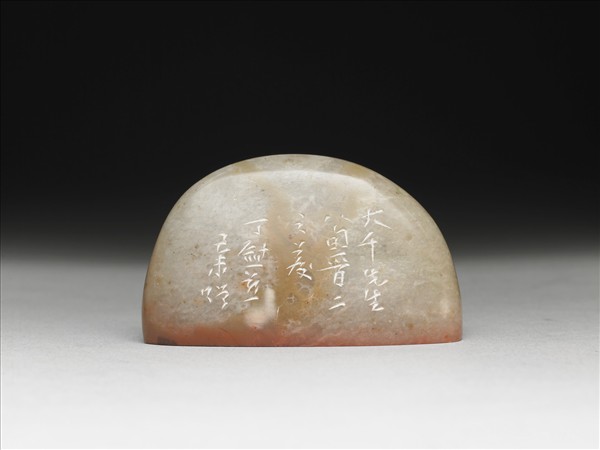 韓國石印,奇石形,印面橢圓偏長,色灰白。印面陽刻三字篆文「外雙溪」。邊款「大千先生八旬晉二之慶。丁慰慈己未贈。石仙刻」。