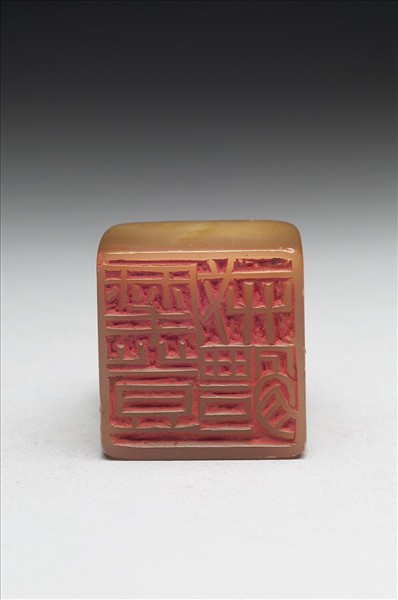 壽山石印,印面正方,色橙黃,石質透潤細緻。印面陽刻四字篆文「摩登戒體」。邊款「大千畫盟屬仿牧甫。癸酉十月。尒疋」。印鈕立雕一獅子,作踡伏貌。尒疋即鄧爾雅(1884-1954),黑山派印家。