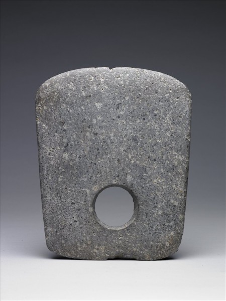 石質,帶有點狀黑斑與白斑,局部有赭斑。全器近於扇面,平背,器兩側斜出,刃略為弧形,刃為中鋒。刃部與背部略有傷缺。